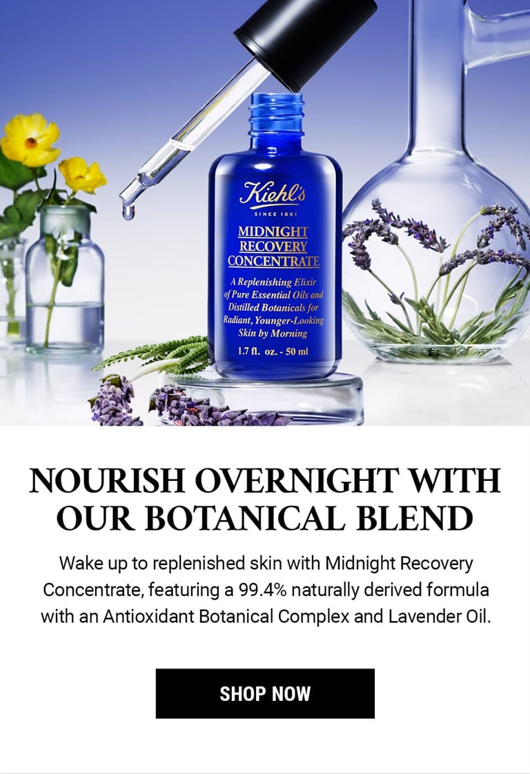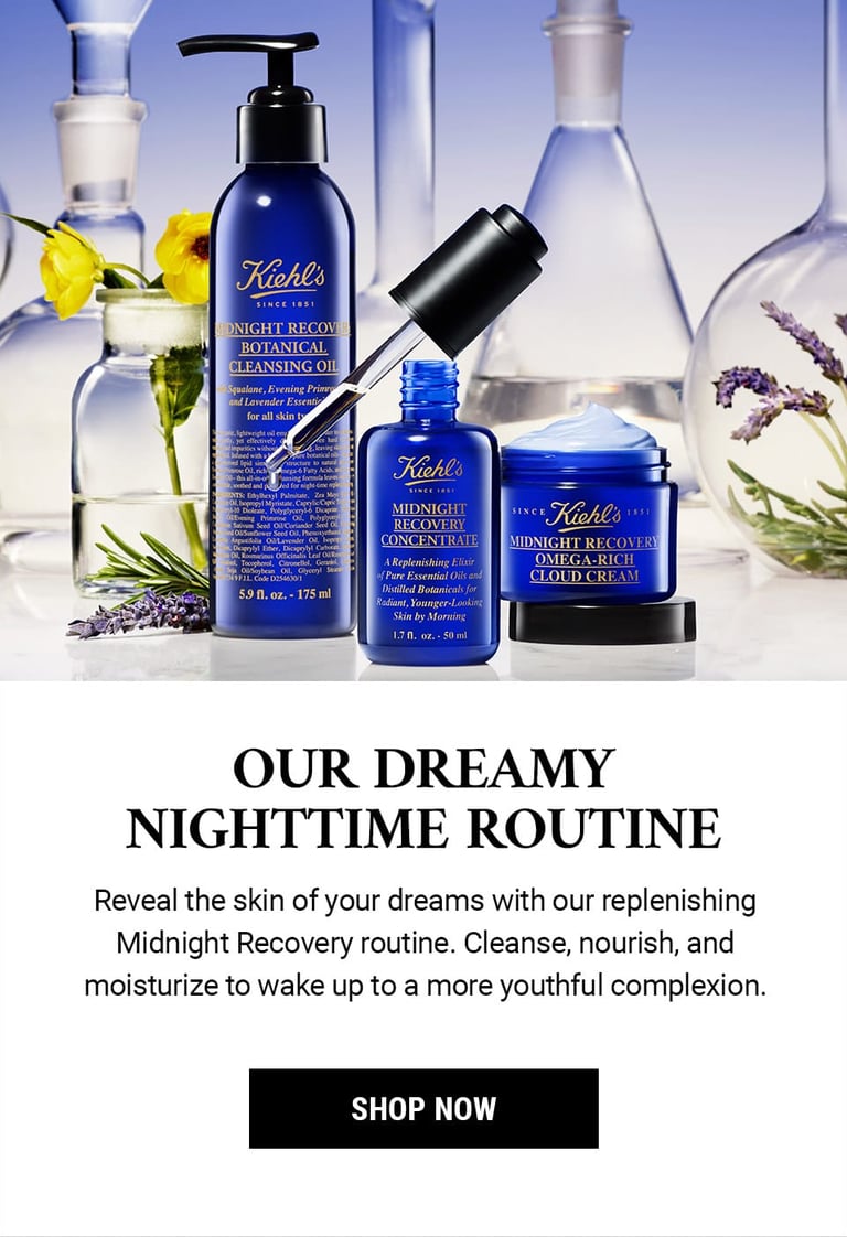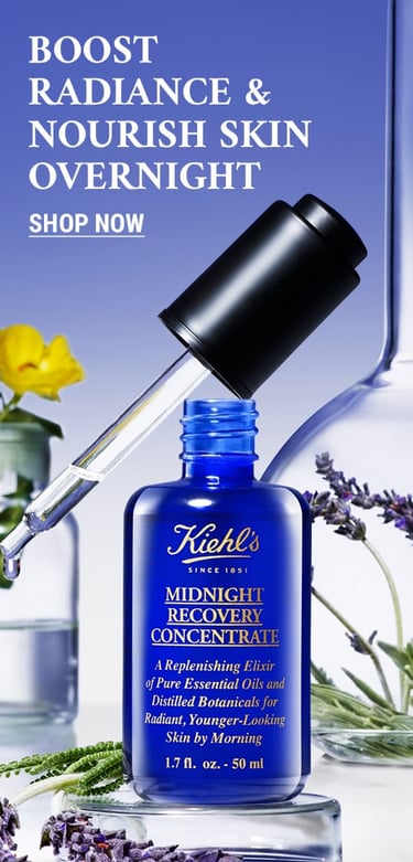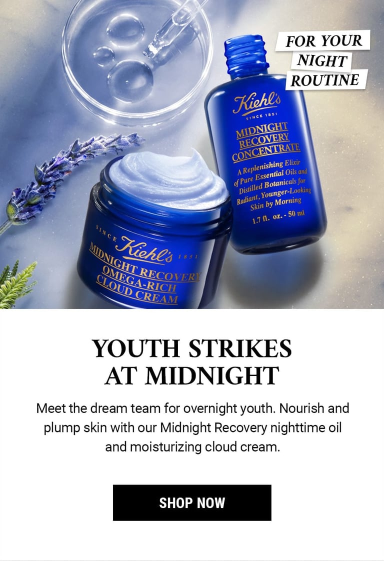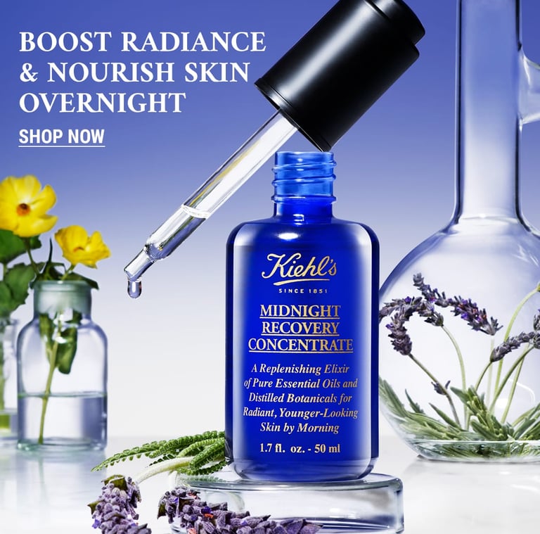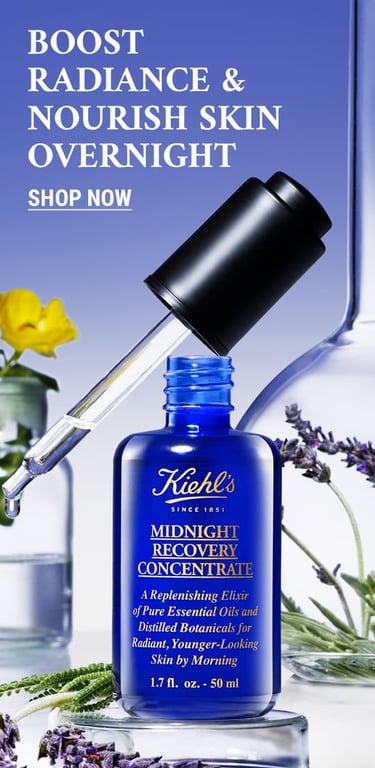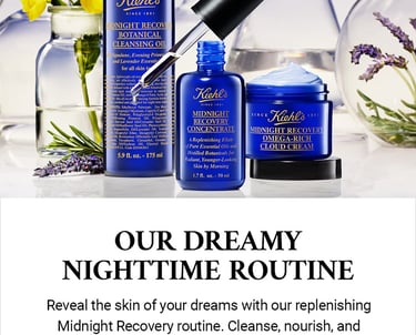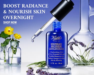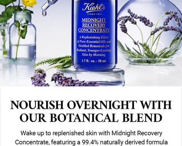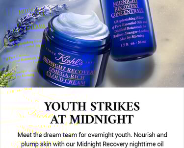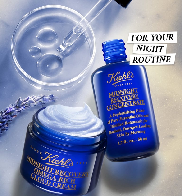 This key visual features a cream and serum as a nighttime duo. The shot is clean and serene, with a soft, glowing vibe that feels both luxurious and calming. I kept Kiehl’s signature blend of science and nature in mind while integrating the dreamy aesthetic of Midnight Recovery.