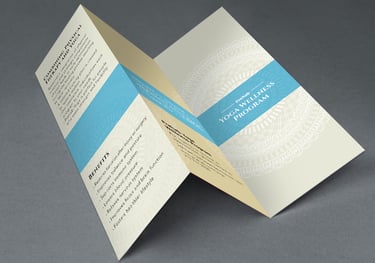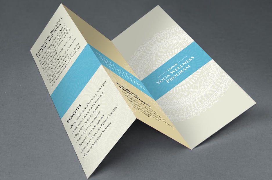 I designed the brochure for a yoga program at a physical therapy office. Featuring calming mandalas, a warm tan background, and soft blue accents, the design creates a serene and inviting vibe. The layout is clean and easy to follow, making it simple for patients to learn about the program and its benefits.