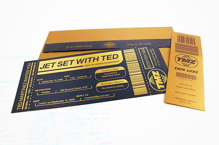 Here’s a high-end birthday party invitation set I designed with an airline theme, inspired by the retro PanAm style. The set includes a ‘plane ticket’ invite, a ‘baggage tag’ with extra details, and a coordinating envelope—all printed on thick blue cardstock with a luxurious gold sheen ink. The result is a sleek, elegant package that sets the tone for a stylish celebration.